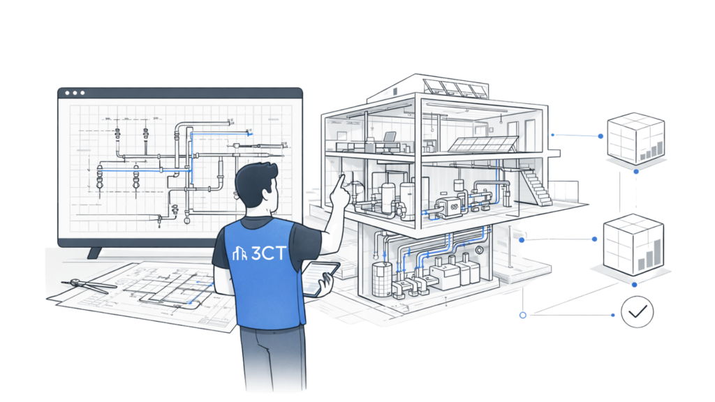 Chez 3CT, nous accompagnons les architectes, maîtres d’ouvrage et entreprises à chaque étape du projet, de la conception à l’optimisation technique. Notre expertise en CVC & fluides garantit des installations performantes, conformes et parfaitement intégrées à l’architecture du bâtiment.